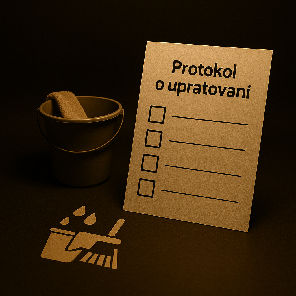 Detailný zoznam upratovacích úkonov (kuchyňa, kúpeľňa, izby, balkón), podpisy a kontrola kvality. Používa sa pri výmene podnájomníkov aj pri pravidelnom upratovaní.